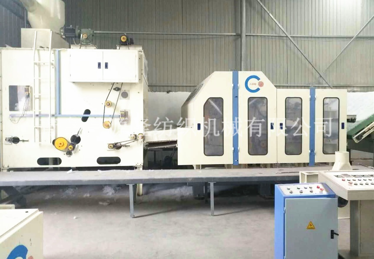 2. CYLSL-氣流梳理成網機(jī):該(gāi)機為雙錫林、雙道夫、四雜亂、羅拉剝取。該機所有輥筒都經調質和定(dìng)性處理後,再精密加工。牆板由鑄(zhù)鐵加工(gōng)而成,針(zhēn)布采用國產優質針布,並配有吸風裝置,可減少(shǎo)清機次數,還(hái)帶有走台(tái)。具有分梳能力強,產量高等(děng)優點。