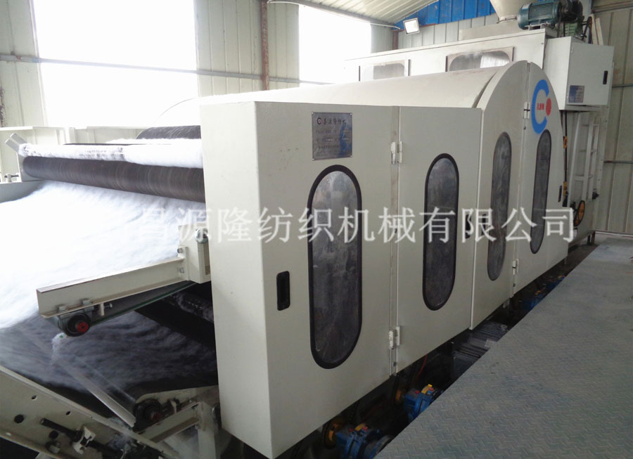 4. CYLSL-2000梳理機:該機為單錫林、雙道夫、四雜(zá)亂、羅拉(lā)剝取。該機所有輥筒都經調質和定性處理後,再精密加工。牆板由鑄鐵加工而成,針布采用國產(chǎn)優質針布,並配有吸風裝置,可減少清機次數,還帶有走台。具有(yǒu)分梳能力強,產量高等優點。