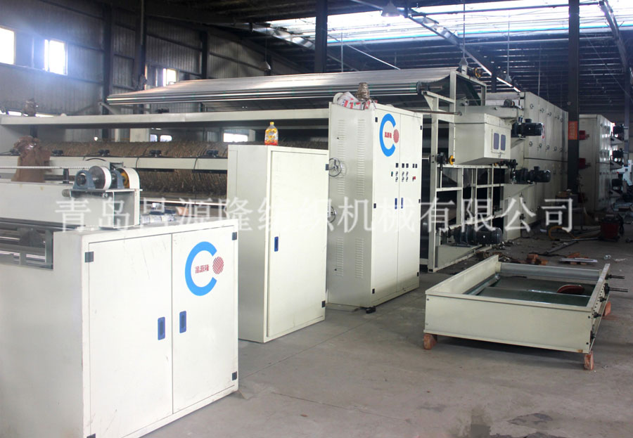 5. CYLPW-2200鋪(pù)網機:機架采(cǎi)用6mm鋼板(bǎn)折彎而成,鋪(pù)網簾(lián)之間加補償電機,減(jiǎn)少纖網牽伸。往複換向用變頻(pín)控製,衝擊力小,能自動緩衝平衡換向,並配有多段速控製。底簾可調(diào)節升降,使棉網能(néng)按照所需要的單位克重均勻鋪疊(dié)到底簾上,供下一道(dào)工序使用。斜(xié)簾﹑平簾和大車平簾用高檔優質皮簾,底簾和環簾為木簾子。