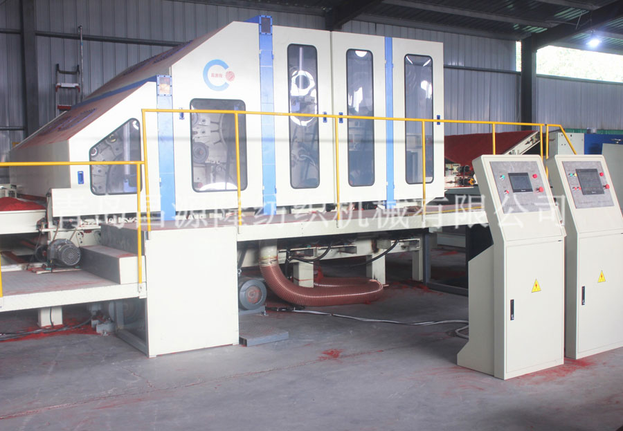 一、高速地毯生產線工藝流程:開包-開鬆機-振動給棉機-梳理機-鋪網機-針刺機(jī)-切邊成卷機