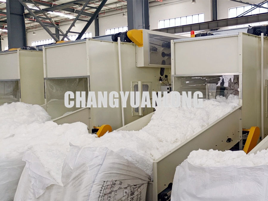 開鬆各種捆包(bāo)化纖(xiān),由電子秤按比(bǐ)例(lì)進行稱量,均勻平鋪在混棉(mián)簾上。