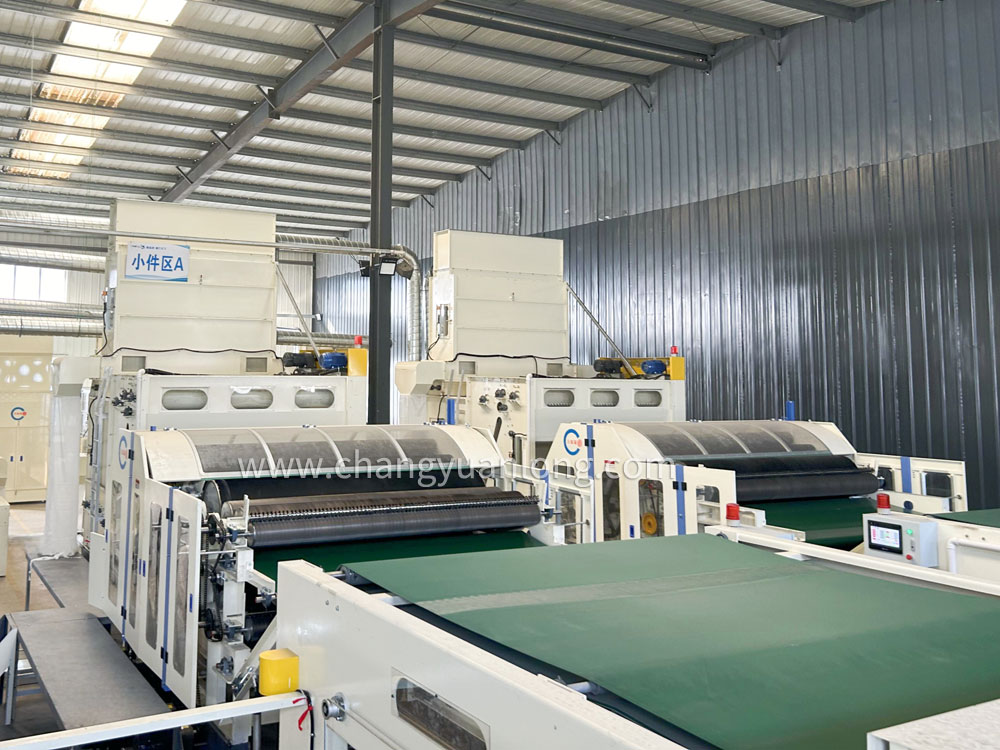 通過各個梳理單元和梳(shū)理輥的速度匹配,來完成對纖維原料的梳理,製成定量均(jun1)勻的薄網,供給鋪網機使(shǐ)用。